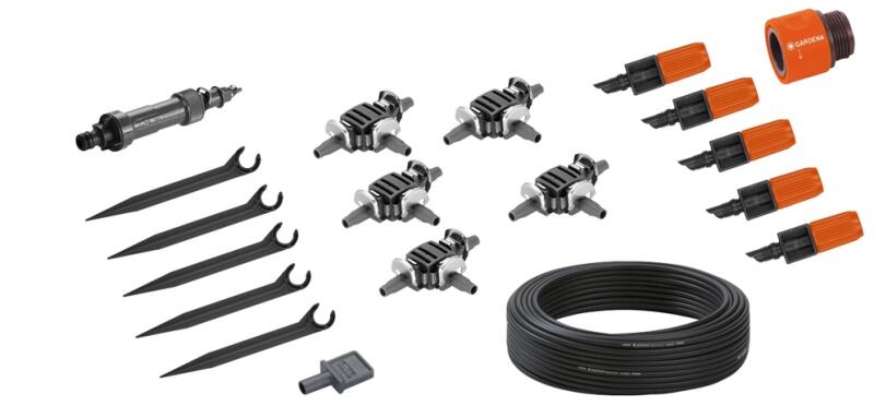 1x alapelem 1000 1x menetes tömlőelem 10 m elosztócső 5x leszúrótüske 4.6 mm 3/16" 5x T-elem 4.6mm 3/16" 1x zárótömítés 4.6 mm 3/16" 5x szabályozható végcsepegtető