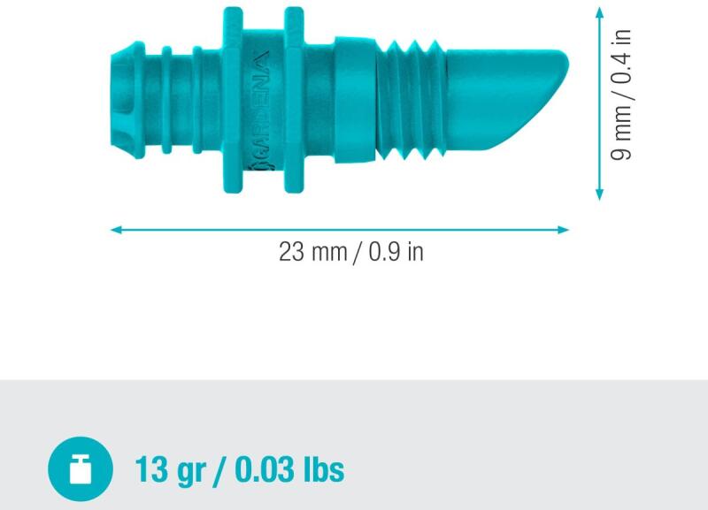 hasonló vízigényű növények öntözésére A GARDENA Micro-Drip-System részét képező végcsepegtető ideális a különálló növények vagy hasonló vízigényű növényekből álló hosszabb sorok, például sövény pontszerű öntözésére. A vízleadása kb. 2 liter/óra. Különálló növények öntözéséhez a végcsepegtetőt egy elosztócső (3/16") végébe kell belecsavarni. A 13 mm-es (1/2") vezetékcső a szerelőeszköz segítségével kilyukasztható; ebbe a lyukba kell beilleszteni a végcsepegtetőt. A csomag 25 csepegtetőt és egy tisztítótűt tartalmaz. A tisztítótű segítségével az elszennyeződött csepegtető könnyen kitisztítható.